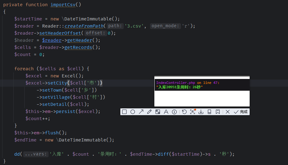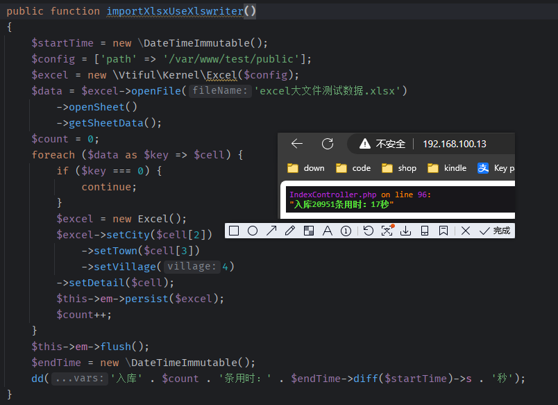 php中导入几万条excel数据的处理方法 langziyang 技术分享 1033 views 我们在开发过程中经常会遇到使用excel导入数据到系统中,如果数据量比较少则可以使用 phpoffice/phpspreadsheet 库进行操作,该库非常的不错,我也经常使用。 但是如果导入的数据非常大,该库可能会非常吃力。我试过导入一个大于16M大小的数据,横轴有两百多个单元格,竖轴有两万一千多条。使用phpoffice/phpspreadsheet读取该文件时就报出了超时以及内存不足的情况。 然后我找到了xlswrite和league/csv库。xlswrite需要你的PHP版本在7.0以上,同时需要你进命令行安装这个PHP扩展,对于不方便的人来就不太现实了。 league/csv是一个php库,作者对该库的描述为: 1. Simple API 2. Read and Write to CSV documents in a memory efficient and scalable way 3. Support PHP Stream filtering capabilities 4. Transform CSV documents into popular formats (JSON, XML or HTML) 5. Framework-agnostic 然后我对这两个库进行了一个测试: 首先是league/csv,注意:使用该库时,csv文件需保存为带BOM的文件  接下来是xlswrite:  可以看出xlswrite比league/csv更快。 在测试过程中我只测试了导入时间,并没有测试内存占用。但是并没有出现像phpoffice/phpspreadsheet报的超出内存限制错误。 帮助PHPZlc项目! 与任何开源项目一样, 贡献代码 或 文档 是最常见的帮助方式, 但我们也有广泛的 赞助机会。 0 赞赏 加入技术群 评论 去登录